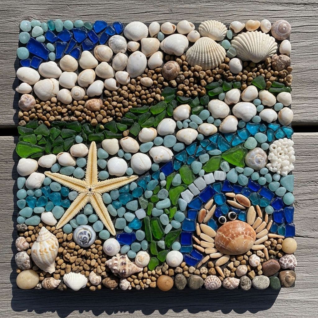 - Školjke, kamenčki, pesek, stekleni kamenčki