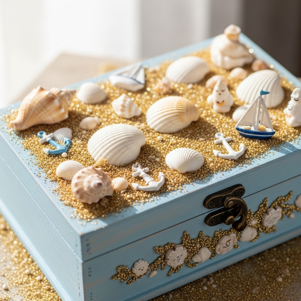 - Okrasite pokrov: Na pokrov škatlice prilepite školjke, bleščice in druge poletne elemente.